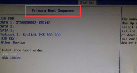 2.成功進(jìn)入BIOS設(shè)置界面后使用方向鍵將箭頭切換至“Startup”選項(xiàng),進(jìn)入“Primary Boot Sequence”主要啟動(dòng)項(xiàng)設(shè)置界面。
