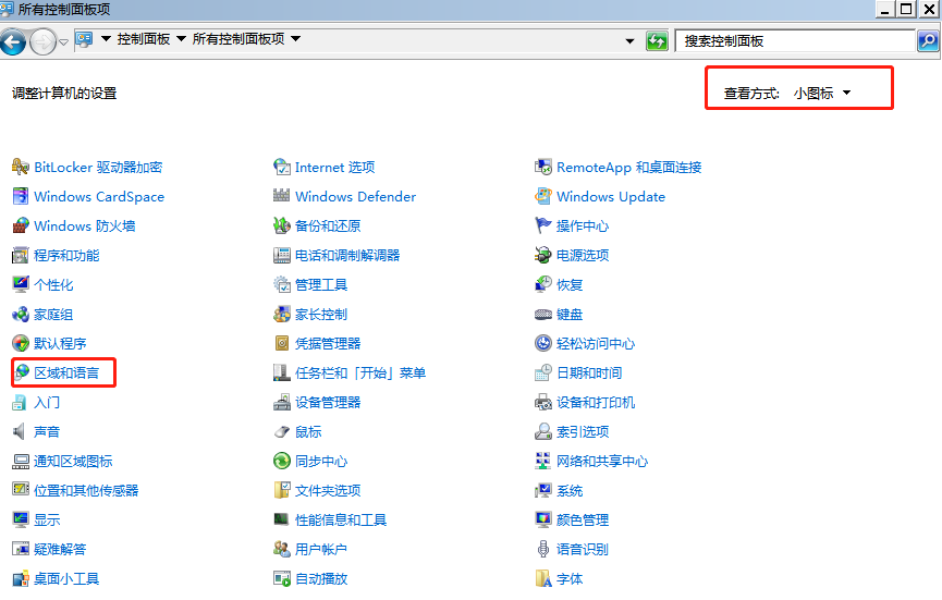 1.打開win7電腦中的控制面板界面,隨后選擇“區(qū)域和語(yǔ)言”進(jìn)入。