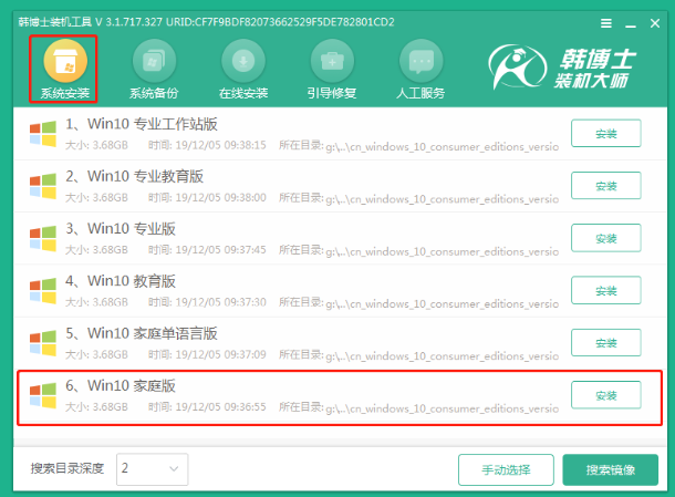 2.進入系統(tǒng)后,韓博士會自動打開搜索系統(tǒng)鏡像,找到鏡像,點擊安裝。