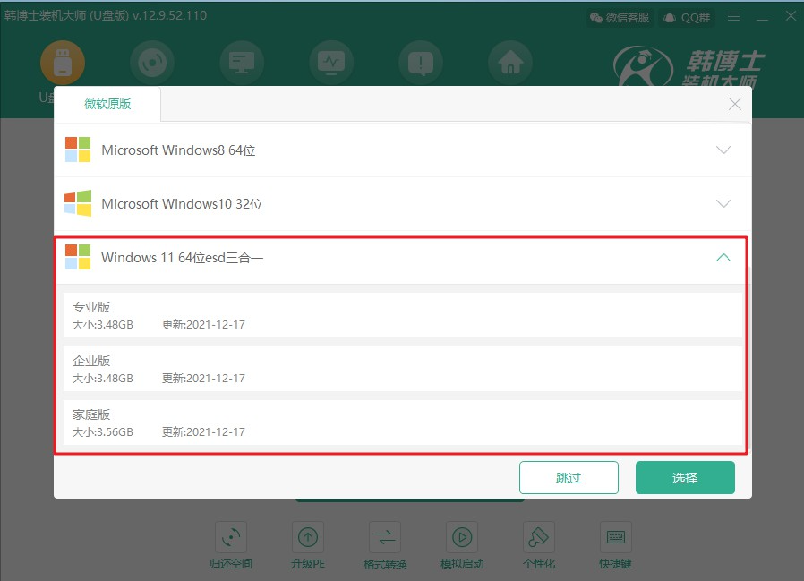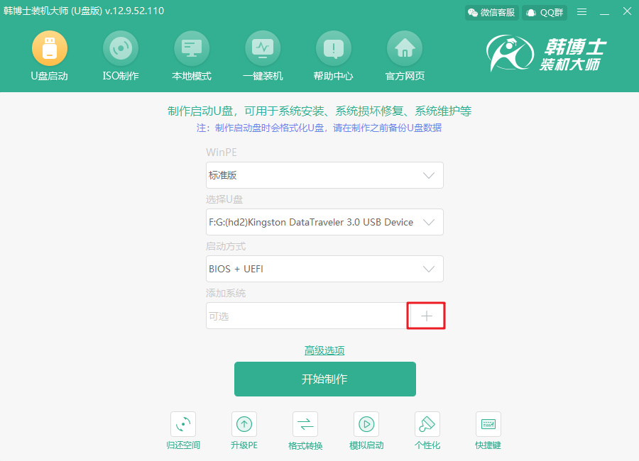 1.打開韓博士裝機大師(U盤版),點擊界面中的“+”,選擇合適的win11系統(tǒng)。