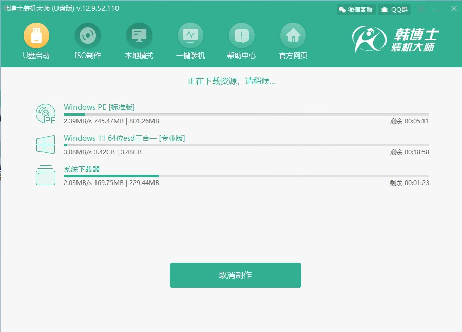 就這樣跟著圖示的流程步驟來,先制作韓博士U盤啟動盤,接著用U盤給電腦裝win11系統(tǒng),就可以成功給電腦裝上win11系統(tǒng)了。如果你剛好也有給自己的電腦裝上win11系統(tǒng)的需要,可以參考上面的教程。如果在重裝的過程遇到問題的話,可以咨詢官網(wǎng)的技術(shù)客服!