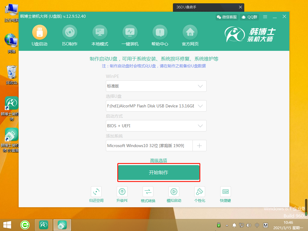 1.制作韓博士U盤啟動盤的時(shí)候,記住要先退出電腦里的殺毒軟件。